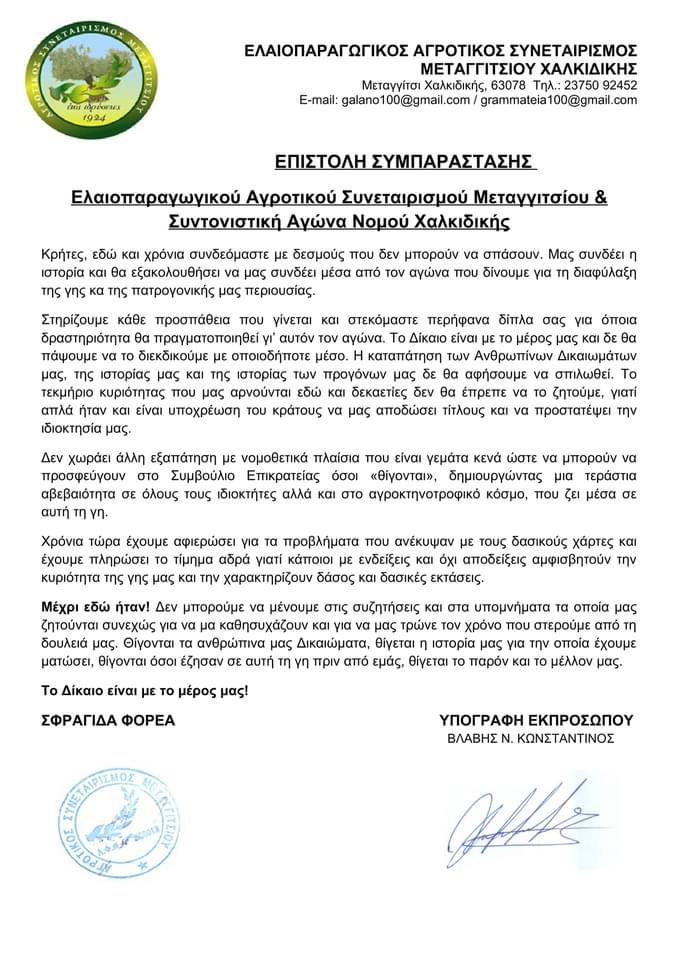 Ολόκληρη η επιστολή του Ελαιοπαραγωγικού Αγροτικού Συνεταιρισμού Μεταγγιτσίου Χαλκιδικής με αφορμή την εκδήλωση – ενημέρωση της Κυριακής για τους δασικούς χάρτες και την εξαπάτηση που βιώνουμε οι Κρητικοί.