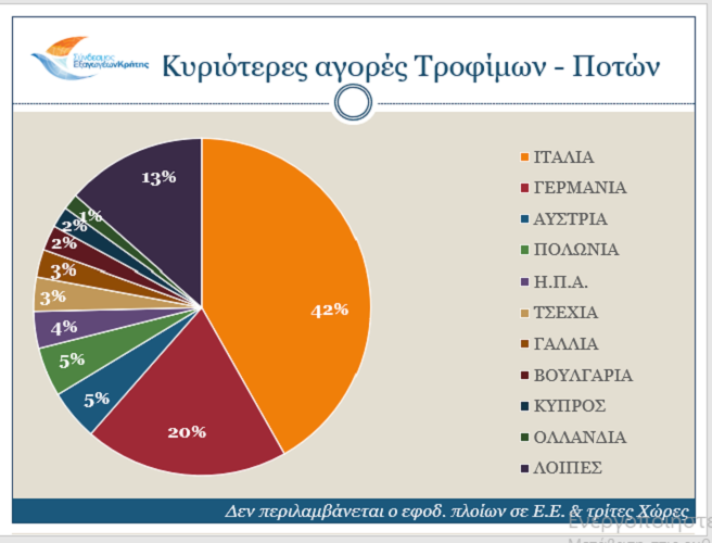 Όσον αφορά στις αγορές του συνόλου των Κρητικών εξαγωγών, πρώτη βρίσκεται η Ιταλία με 65,5 εκ. ευρώ και μερίδιο 28%, δεύτερη η Γερμανία με 39,9 εκ. ευρώ και μερίδιο 17,1%, και ακολουθεί η Γαλλία με 14,4 εκ. ευρώ και μερίδιο 6,2%. Την πεντάδα κλείνουν η Πολωνία (12,5 εκ. ευρώ και 5,4%), και η Αυστρία (8,6 εκ. ευρώ και 3,7%). Για τα τρόφιμα & ποτά, τους κυριότερους αγοραστές αποτελούν η Ιταλία (μερίδιο 41,8%), η Γερμανία (19,7%), η Αυστρία (4,9%), η Πολωνία (4,7%) και οι Η.Π.Α. (3,6%).