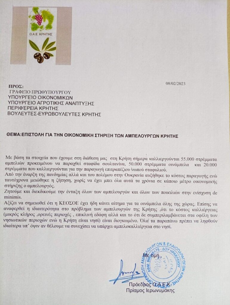 “Όλα τα παραπάνω θα πρέπει να ληφθούν ιδιαίτερα υπόψιν, αν θέλουμε να συνεχίσει να υπάρχει αμπελοκαλλιέργεια στο νησί” – καταλήγει η επιστολή, την οποία υπογράφει ο πρόεδρος της Οργάνωσης, Πρίαμος Ιερωνυμάκης.