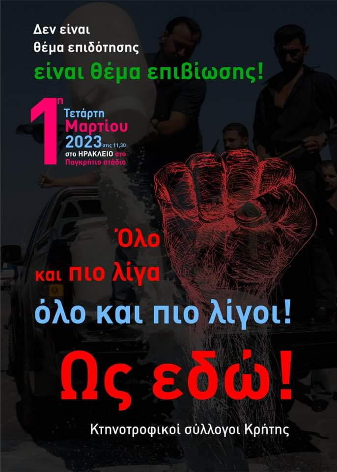 Παγκρήτιο συλλαλητήριο διοργανώνουν οι κτηνοτρόφοι την 1η Μαρτίου σύμφωνα με απόφαση των Κτηνοτροφικών Συλλόγων Κρήτης που ελήφθη στις 14 Φεβρουαρίου σε συνάντησή τους στο Ρέθυμνο.
