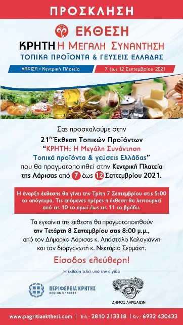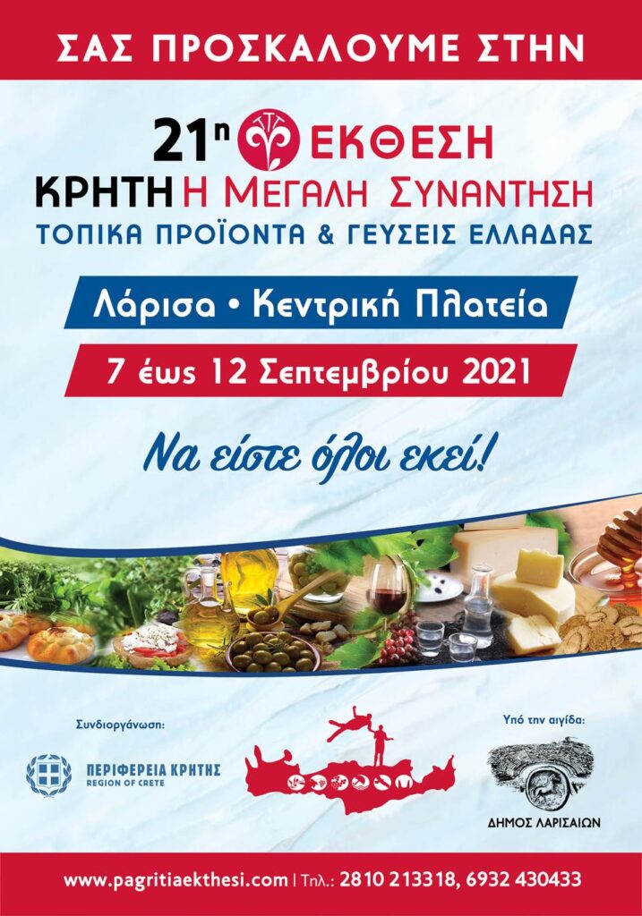 Γεύσεις, μυρωδιές και αρώματα από εκλεκτά προϊόντα θα πλημμυρίσουν την Κεντρική Πλατεία της Λάρισας από τις 7 έως τις 12 Σεπτεμβρίου 2021, μέσα από την έκθεση “Κρήτη η Μεγάλη Συνάντηση και Τοπικές Γεύσεις Ελλάδας” που θα πραγματοποιηθεί εκεί, με χορηγό επικοινωνίας το Agrocretanews.gr
