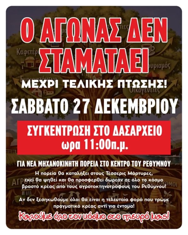 Σε νέα δυναμική διαμαρτυρία προχωρούν οι αγροκτηνοτρόφοι Ρεθύμνου το Σάββατο 27 Δεκεμβρίου, επιβεβαιώνοντας τη συνέχιση των αγωνιστικών τους δράσεων. Σύμφωνα με τον προγραμματισμό, η συγκέντρωση θα ξεκινήσει στις 11:00 το πρωί στο Δασαρχείο. Οι διοργανωτές απευθύνουν κάλεσμα προς την τοπική κοινωνία να σταθεί στο πλευρό τους κατά τη διάρκεια των διεκδικήσεών τους.