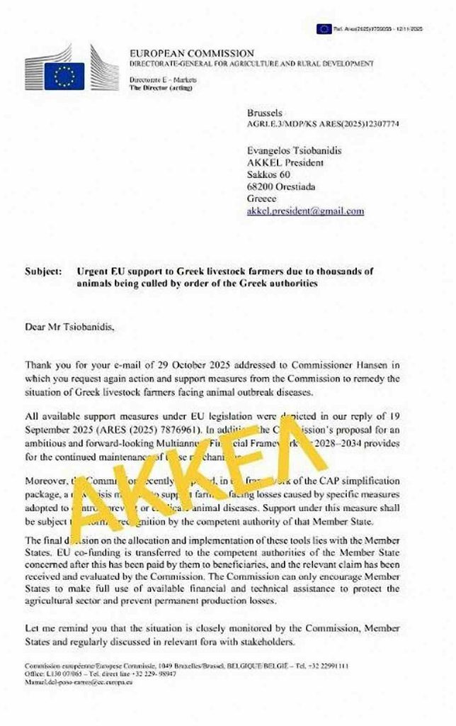 Το ΑΚΚΕΛ ενημερώνει τους Έλληνες κτηνοτρόφους και την κοινή γνώμη ότι η Ευρωπαϊκή Επιτροπή, μέσω της Γενικής Διεύθυνσης Γεωργίας (DG AGRI), απέστειλε επίσημη απάντηση προς τον Πρόεδρο του ΑΚΚΕΛ, Ευάγγελο Τσιομπανίδη, τον Οκτώβριο του 2025, σχετικά με την ανάγκη άμεσης στήριξης των παραγωγών που υπέστησαν μαζικές απώλειες λόγω επιζωοτιών.