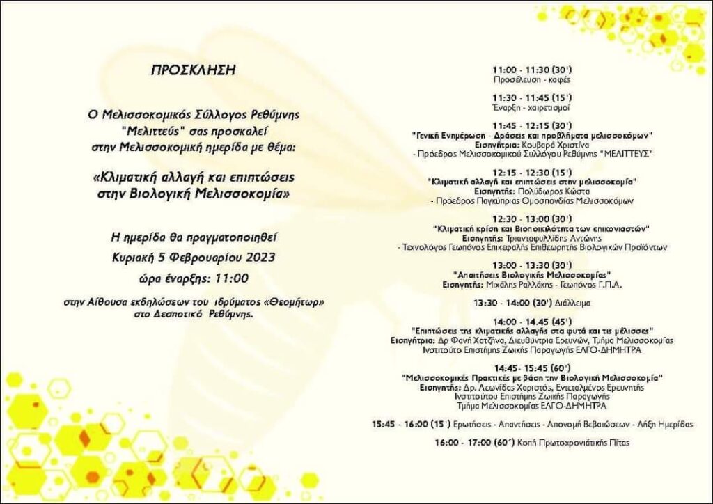 Με ιδιαίτερο ενδιαφέρον θα πραγματοποιηθεί ημερίδα του Μελισσοκομικού Συλλόγου Ρεθύμνης «ΜΕΛΙΤΤΕΥΣ» με θέμα «Κλιματική αλλαγή και επιπτώσεις στην Βιολογική Μελισσοκομία» την Κυριακή 5 Φεβρουαρίου 2023 από 11.00 έως 17.00 στην αίθουσα εκδηλώσεων του ιδρύματος «Θεομήτωρ» – Δεσποτικό Ρεθύμνης