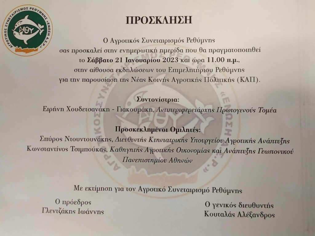Ενημερωτική εκδήλωση πραγματοποιεί ο Αγροτικός Συνεταιρισμός Ρεθύμνης το Σάββατο 21 Ιανουαρίου για την παρουσίαση της Νέας Κοινής Αγροτικής Πολιτικής.