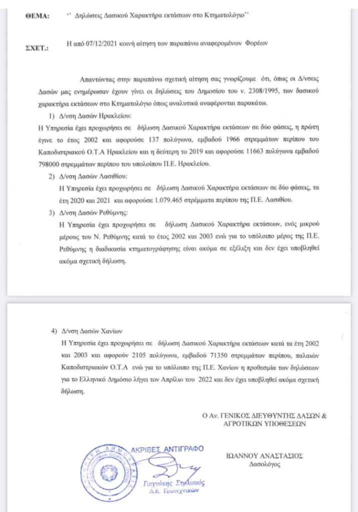 Έπειτα από ερώτημα που υπέβαλαν ο Σύλλογος Επαγγελματιών Κτηνοτρόφων Νόμου Ρεθύμνης και ο Κτηνοτροφικός Σύλλογος Αμαρίου προς την Αποκεντρωμένη Διοίκηση Κρήτης έλαβαν την απάντηση ότι οι δασικού χαρακτήρα εκτάσεις που δηλώθηκαν στο Κτηματολόγιο και διεκδικεί το Ελληνικό Δημόσιο είναι οι κάτωθι: