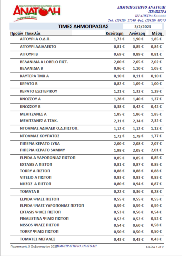 6 Φεβρουαρίου 2023 Παίζει Τώρα Α.Σ. ΑΝΑΤΟΛΗ: Τιμές Αγροτικών Προϊόντων 03-02-2023 FacebookTwitterPinterestWhatsApp agrocretanews Σχετικά Άρθρα Εκπαίδευση για ελαιοπαραγωγούς, ελαιοτριβείς και τυποποιητές στο Δήμο Ιεράπετρας Με ιδιαίτερη επιτυχία ολοκληρώθηκε η εκπαίδευση ελαιοπαραγωγών στον Δήμο Κισσάμου που διοργανώθηκε από την... 28 Απριλίου 2026 Παρέμβαση Βουλευτών Νέας Αριστεράς στη Βουλή για καθυστέρηση ενεργοποίησης του ΟΣΔΕ 2026 & επιπτώσεις σε ρευστότητα πρωτογενούς τομέα Ερώτηση στη Βουλή των Ελλήνων με τίτλο «Καθυστέρηση ενεργοποίησης του ΟΣΔΕ 2026 και επιπτώσεις... 28 Απριλίου 2026 Φράγμα Αποσελέμη: Πάνω από 12 εκατ. κυβικά νερού – Ο σχεδιασμός για την χρονιά Σημαντικά ενισχυμένα εμφανίζονται τα αποθέματα νερού στο φράγμα Αποσελέμη, καθώς ο ταμιευτήρας διαθέτει σήμερα 12.610.000 κυβικά... 28 Απριλίου 2026 Ημερίδα «Γνώση» – Πέμπτη 30 Απριλίου Ημερίδα «Γνώση» - Πέμπτη 30 Απριλίου Κτίριο ΕΛΓΟ (πρώην ΕΘΙΑΓΕ) Ο Σύνδεσμος Βιοκαλλιεργητών Θεσσαλίας (ΣΒΘ) σε συνεργασία με... 28 Απριλίου 2026 Λασίθι: Η «χρυσή» βροχή έσωσε την ελαιοκομία – Η φύση «ξύπνησε» μετά από τρία χρόνια ξηρασίας! Μετά από τρία χρόνια ξηρασίας, οι ουρανοί άνοιξαν στην Ανατολική Κρήτη, με το Σελάκανο... 28 Απριλίου 2026 Πρόσφατα άρθρα Εκπαίδευση για ελαιοπαραγωγούς, ελαιοτριβείς και τυποποιητές στο Δήμο Ιεράπετρας Παρέμβαση Βουλευτών Νέας Αριστεράς στη Βουλή για καθυστέρηση ενεργοποίησης του ΟΣΔΕ 2026 & επιπτώσεις σε ρευστότητα πρωτογενούς τομέα Φράγμα Αποσελέμη: Πάνω από 12 εκατ. κυβικά νερού – Ο σχεδιασμός για την χρονιά Ημερίδα «Γνώση» – Πέμπτη 30 Απριλίου Λασίθι: Η «χρυσή» βροχή έσωσε την ελαιοκομία – Η φύση «ξύπνησε» μετά από τρία χρόνια ξηρασίας! ΑΦΗΣΤΕ ΜΙΑ ΑΠΑΝΤΗΣΗ Ακύρωση απάντησης Σχόλιο: εισάγετε το σχόλιό σας! Όνομα:* παρακαλώ εισάγετε το όνομά σας εδώ Email:* έχετε εισάγει εσφαλμένη διεύθυνση ηλεκτρονικού ταχυδρομείου! παρακαλώ εισάγετε εδώ την ηλεκτρονική σας διεύθυνση Ιστοσελίδα: αποθηκεύστε το όνομα, το ηλεκτρονικό ταχυδρομείο και τον ιστότοπό μου σε αυτό το πρόγραμμα περιήγησης για την επόμενη φορά που θα σχολιάσω.