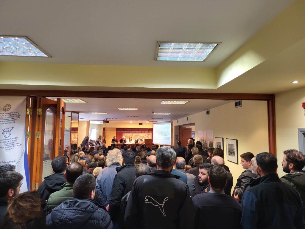 Στην αίθουσα επικρατεί το… αδιαχώρητο με τον αγροτικό και κτηνοτροφικό κόσμο, να ενδιαφέρεται να μάθει τι θα ισχύσει με την καινούργια ΚΑΠ.