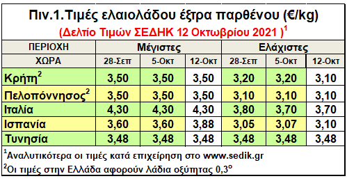 Σύμφωνα με το Δελτίο τιμών του ΣΕΔΗΚ της 12 Οκτωβρίου (www.sedik.gr) , οι υψηλότερες τιμές για το έξτρα 0,3ο στην Κρήτη και Πελοπόννησο δείχνουν να φτάνουν στα 3,50€/kg. Αφορούν όμως μεμονωμένες περιπτώσεις Συνεταιρισμών που πουλούν με διαγωνισμούς όπως ο Α.Σ. Κριτσάς ή ιδιωτών που συνήθως προσφέρουν υψηλότερες τιμές όπως το Ελαιοτριβείο ΣΚΟΥΡΑΣ Ε.Ε. στην Σπάρτη και ο Α.Σ. Συκέας στην Μονεμβασία Λακωνίας.