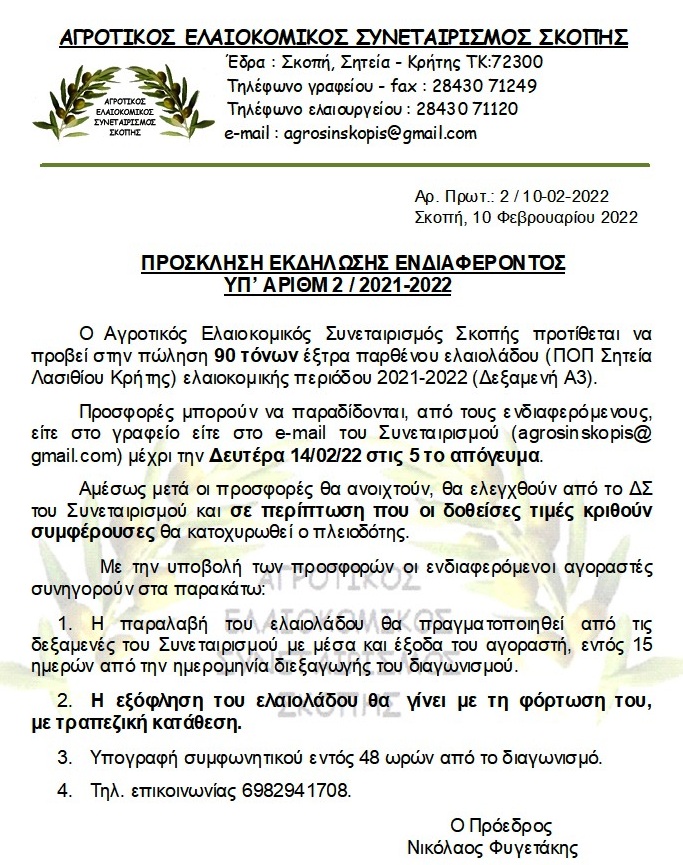 Ο Αγροτικός Ελαιοκομικός Συνεταιρισμός Σκοπής ακολουθώντας καλές πρακτικές για την διάθεση του ελαιολάδου πρόκειται να δημοπρατήσει 90 τόνους έξτρα παρθένου ελαιολάδου ΠΟΠ Σητείας.