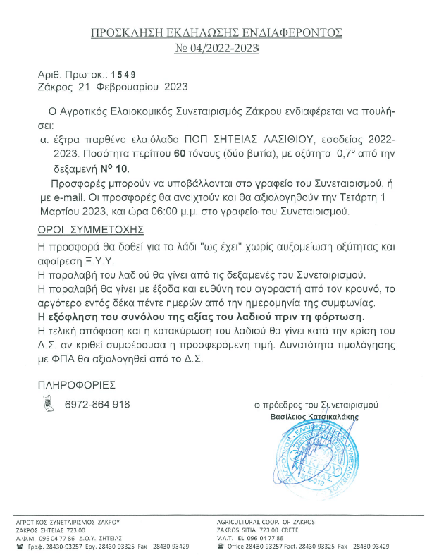Ο Αγροτικός Ελαιουργικός Συνεταιρισμός Ζάκρου ακολουθώντας τις καλές πρακτικές για την διάθεση ελαιολάδου προκυρήσσει διαγωνισμό πώλησης έξτρα παρθένου ελαιολάδου οξύτητας 0,7% και αναζητά προσφορές μέχρι την Τετάρτη 01 Μαρτίου 2023.